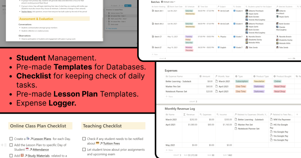 - Pre-made Notion Database Templates to get a view of all details of a student, like Attendance, Assignments/Exam allocated, answers submitted, total/average scores, Fees submitted, receipts, school, class, subjects opted to study for and associated batch in which they will study.